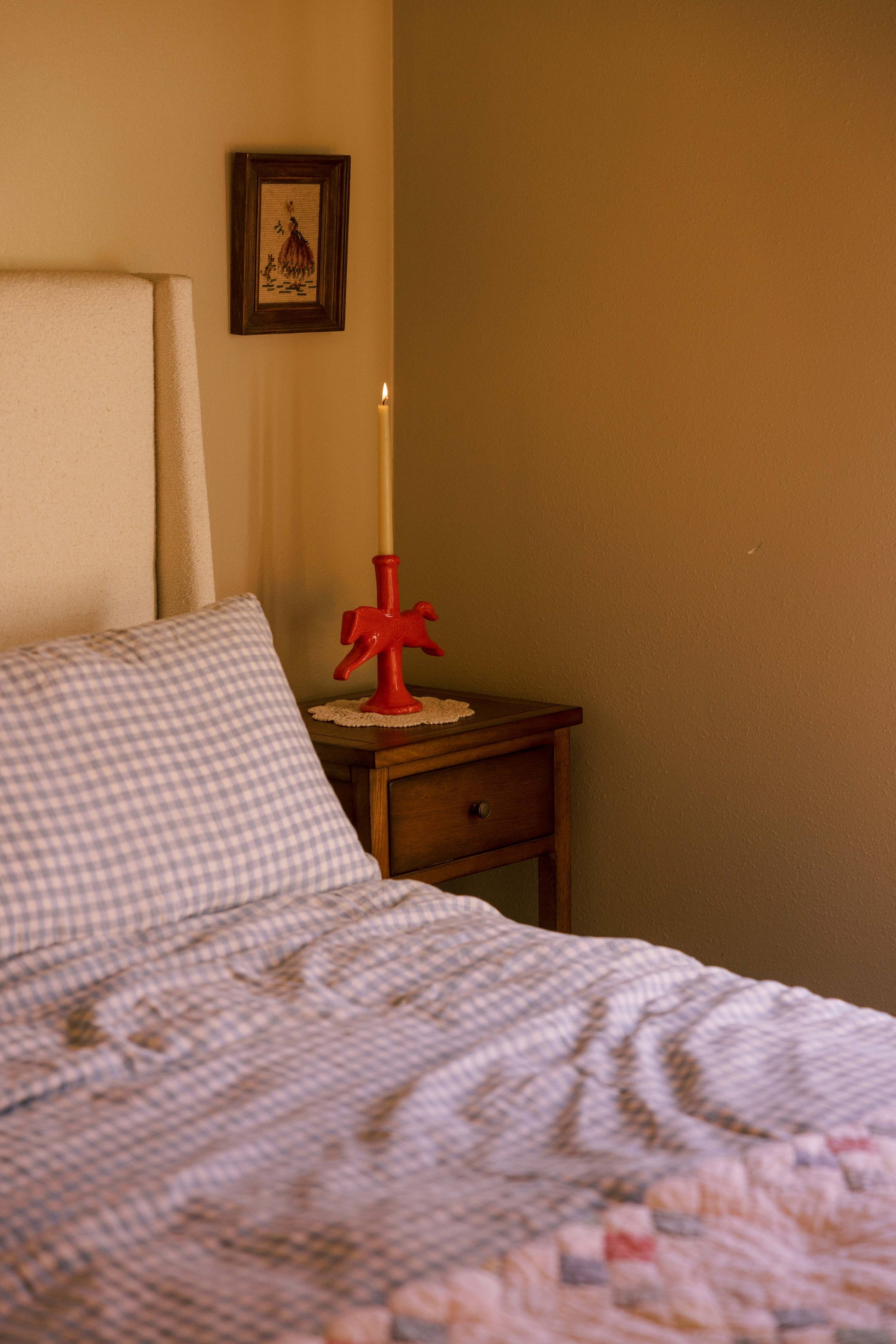 Meet the Dala Horse Candlestick Holder made by St Bingo, a sculptural ceramic candle stand inspired by Swedish folk art. Every piece is glazed by hand, giving it soft, organic texture and gentle variation in color. No two pieces are exactly alike, each candle holder has its own subtle personality, small marks, glaze variation, and charm are part of the handmade process.