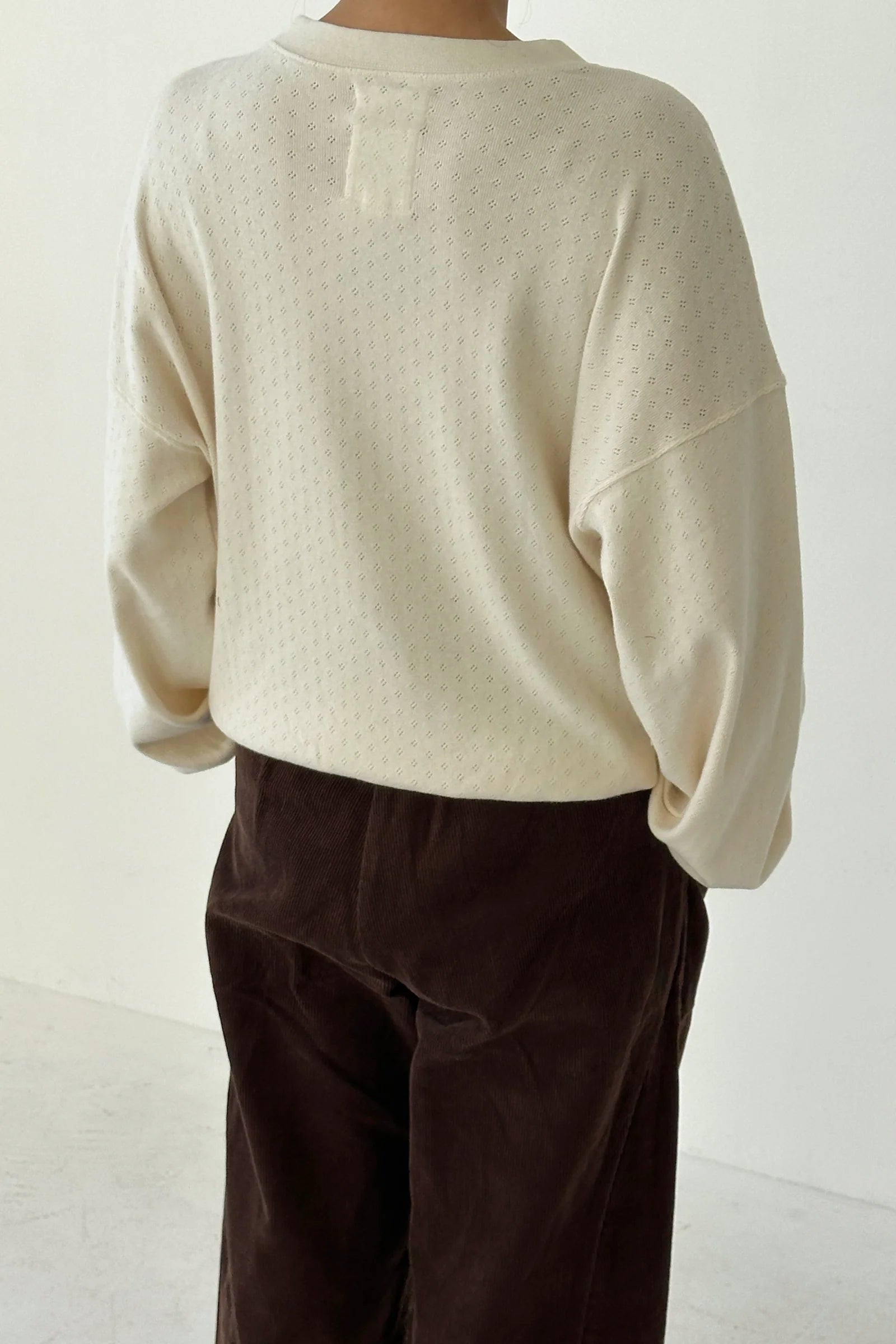 A lightweight layer for shifting seasons. The Pointelle Core Sweatshirt is made from ultra-soft jersey pointelle, offering just the right mix of breathability and warmth. With its relaxed drape and voluminous sleeves, it’s a refined take on cozy.